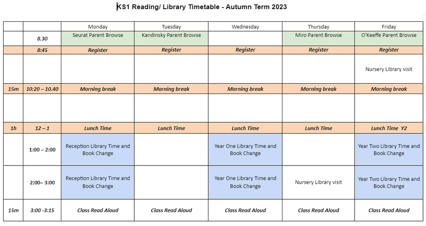 Please see the Reception and Y1 library times when parents can browse with their children in the morning.